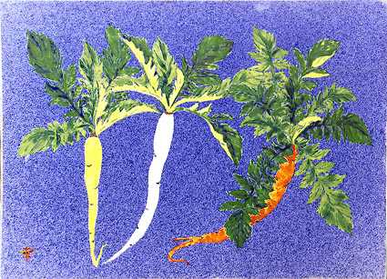 野草・野菜のような野卑ともいえる画題は、「やつし」の文化背景を持つ日本ではことさら好まれ、俳画や鍋島意匠にも多く見られます。