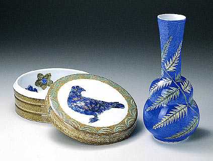 お二人との出会いは、昭和五十七年頃。その後も何度も拝見。東京・大阪・名古屋をはじめ各地の個展の案内をいただき、その活動範囲の広がりに目をみはっています。純白の薄い素地と釉裏彩(ゆうりさい)、濃い藍の染付(そめつけ)に赤・緑が加わり、その上の金彩も美しい。繊細で斬新な作品を愛好するファンも多いと聞きます。