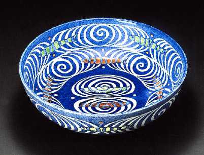 Bowl with design of fish and streams painted in the underglaze. |