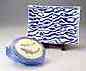 陶箱の波文は周辺の染付と中心の金彩による切り替え、長角皿は皿中央の藍と白の切り返しによって流水の変化と奥行きをつけています。