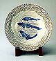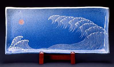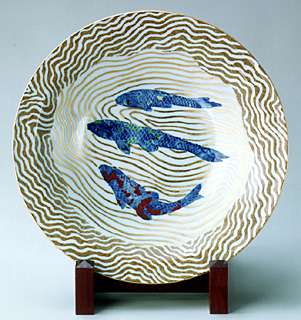 金・釉裏紅流水鯉図大皿(2000年)(35.7×6.7cm) 金・釉裏紅流水鯉図大皿(2000年)(35.7×6.7cm) 縁の流水模様は吹き墨で銹花の絵の具を用い、中の金とで片身替わりを作っています。中央に釉裏彩 で鯉を泳がせました。 第3回静岡松坂屋二人展 の案内葉書タイトルです。 ▲