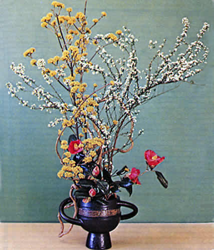 サンシュウは、春の力強さの表現として、つかってみました。ユキヤナギとフジゾルは、躍動感を出すためのもので、これらはサラした白っぼい何かとかわると、ずいぶん都会的なものになって、いち段とひきたつことでしょう。
