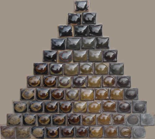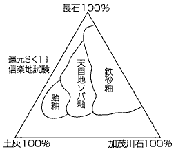 これを見ますと、だいたい、長石の多い部分で 『鉄砂』〜『黒天目』、土灰の多い部分で『いらぼ釉』〜『飴釉』。それより藁灰の多い部分では乳濁『なまこ手』。藁灰のひじょうに多いところは不熔です。