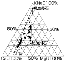 福島長石−土灰−加茂川石系の一部を三角座標による性状図を示しましょう。